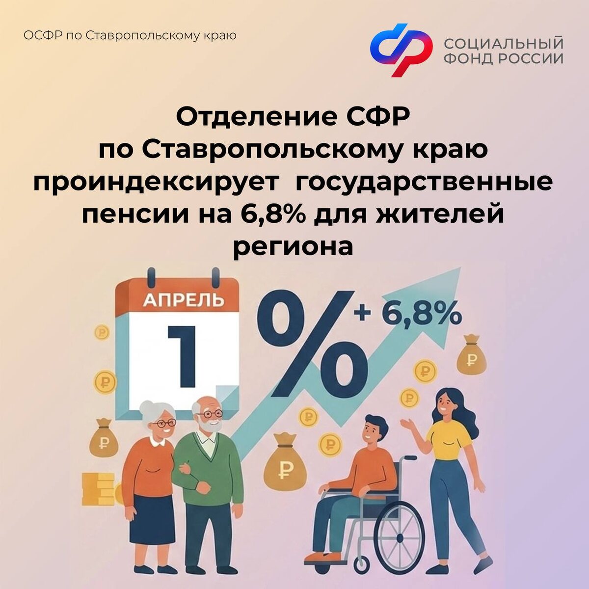 , в том числе социальные. Традиционное повышение состоится с 1 апреля. 📈Уровень индексации определен, исходя из роста прожиточного минимума пенсионера за прошлый год и составит 6,8%. 🔴Проиндексированные пенсии поступят гражданам региона в апреле по обычному графику доставки. 📌Фактические размер прибавки будет зависеть от размера пенсии до индексации. ❤️Подписывайтесь на Отделение СФР по Ставропольскому краю в Телеграмм, чтобы быть в курсе актуальной информации. #СФР #индексация #пенсии #1200