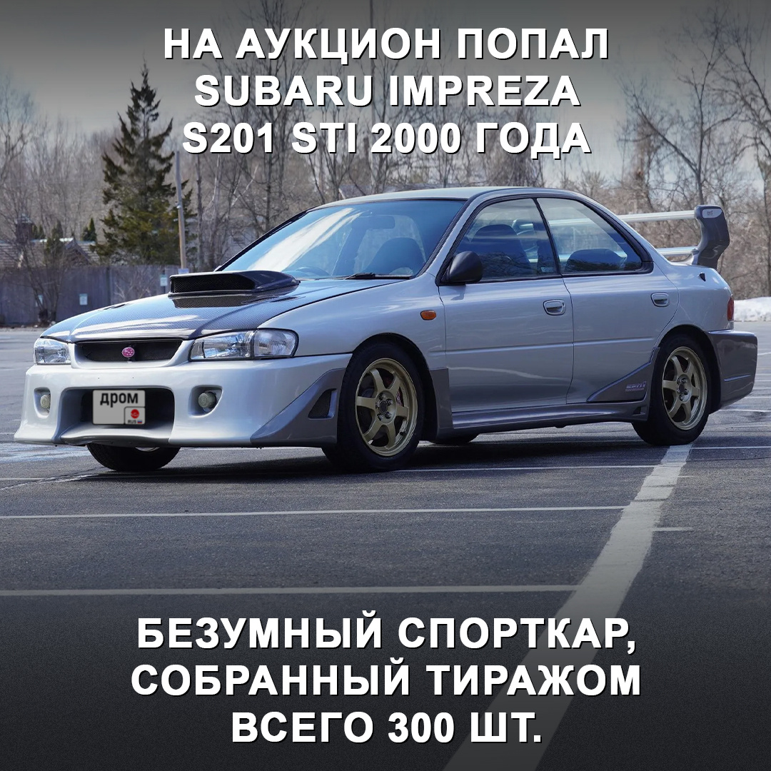 Снаружи спорткар выглядит как обычная Impreza с кучей тюнинга с AliExpress, но именно таким его выпустили в 2000 году — с аэродинамическим обвесом, огромным антикрылом и чёрным карбоновым капотом с воздуховодом. Под капотом — 2-литровый турбооппозитник EJ20 на 300 л.с. (353 Нм), который работает в паре с 5-ступенчатой механикой. У машины полный привод, два дифференциала повышенного трения, усиленная подвеска, кованые диски RAYS и около 5 сек. до сотни. Пробег экземпляра на фото — около 160 000 км, номер на табличке спецсерии — 20 из 300. Как думаете, за сколько может уйти один из самых редких серийных Субару из золотой эры компании? 🤔 #дромновость #аукцион #subaru #impreza #s201sti
