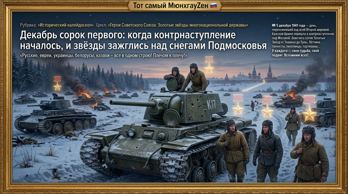 🚨 P.S. Декабрь сорок первого. Месяц, когда советские войска впервые за всю войну перешли в наступление и погнали врага от стен Москвы. Месяц, когда сотни героев получили Золотые Звёзды — и столько же, если не больше, совершили подвиги, оставшись без наград. Но память не знает званий. Она помнит имена. И сегодня, в 2026-м, в Год единства народов России, эти имена — русские, еврейские, украинские, белорусские — звучат для нас одинаково. Потому что все они — наши. Все они — герои. Все они — те, кто спас страну.