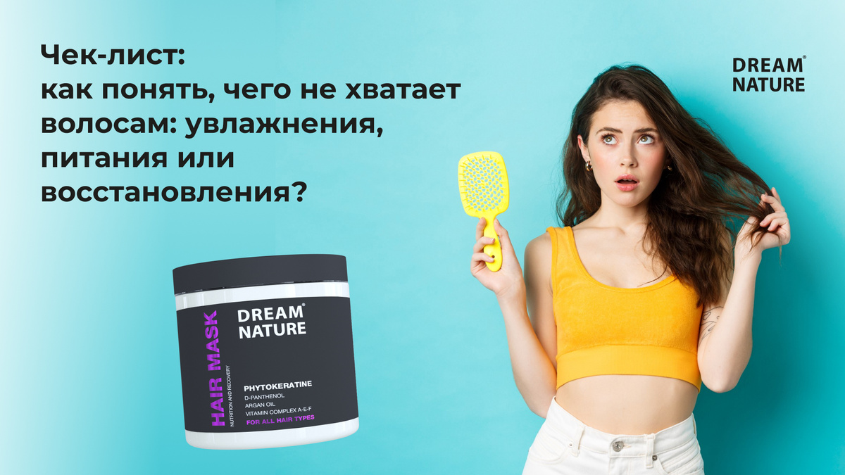 Чтобы понять, чего именно хотят ваши волосы, нужно оценить их текстуру, эластичность и внешний вид. Наша простая шпаргалка поможет расшифровать их «сигналы»: Нужно, если волосы сухие, как солома, пушатся и сильно электризуются. Если потянуть влажный волосок, он легко порвется без растяжения. Что искать в составе: глицерин, алоэ вера, гиалуроновая кислота, пантенол. Нужно, если волосы выглядят тусклыми, «пустыми» и истощенными. Обычно это актуально для пористых, вьющихся или поврежденных волос. Распознать проблему можно по секущимся кончикам, ломкости, отсутствии тяжести и гладкости. Что искать в составе: натуральные масла (аргановое, ши, кокосовое, жожоба), жирные кислоты. Нужно волосам, пострадавшим от химических процедур или высоких температур (осветление, химия, регулярная «горячая» укладка). Волосы в таком случае тянутся как резинка или просто отламываются копной. Что искать в составе: кератин, протеины (шелка, пшеницы), аминокислоты, керамиды. Маска для волос DREAM NATURE – глубок