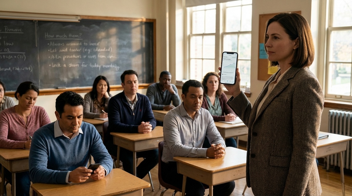 Ноябрь. Родительское собрание. Елена Викторовна рассказывает про четверть, оценки, олимпиады. Мамы сидят, кивают, записывают. Ольга Дмитриевна в первом ряду, с блокнотом, командует.