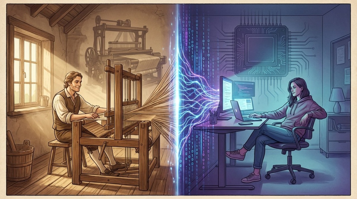 До промышленной революции ткачи были элитой рабочего класса. Их работа требовала мастерства, навыков, многолетнего обучения, а условия труда у них были отличные! Они сами решали, когда работать, а когда отдыхать. Могли работать из дома или вообще на улице, потому что станок был переносной. Некоторые особо талантливые ребята работали всего 4 дня в неделю. При этом они хорошо зарабатывали, а также сами контролировали свой график и темп По сути, это были фрилансеры XVIII века с высоким доходом и свободой. А потом появились фабрики с паровыми станками. И за несколько десятилетий всё перевернулось: то, что ткачи делали руками долго и дорого, машина стала делать быстрее и дешевле. Ткачи оказались не нужны. Часть ушла на те же фабрики, где им платили низкую зарплату и заставляли работать по 12 часов в день, а часть просто осталась без работы. Сегодняшние «белые воротнички» (копирайтеры, аналитики, дизайнеры, юристы, программисты) — это те же ткачи. У многих удалёнка, гибкий график, хорош
