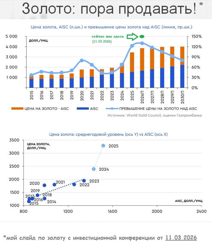 📉 Когда я в марте окончательно и бесповоротно распродавал золото в своём портфеле (напомню, у меня оно было представлено в виде фонда на золото #TGLD, купленных в далёком 2022 году), то и подумать не мог, что очень чётко поймаю хай, после которого буквально на следующий день началась глубокая коррекция в мировых ценах на жёлтый металл. На приведённой ниже картинке один из слайдов с моей инвестиционной конференции с громким заголовком "Золото: пора продавать", которая состоялась 11 марта 2026 года, и в рамках которой я призывал обратить внимание на хайп в золоте и задуматься о глобальной фиксации позиции. На сегодняшний день глубина коррекции составляет внушительные -22%, и это всего за каких-то три недели, которые прошли с тех пор! ❓Почему я тогда решил, что пора на выход?