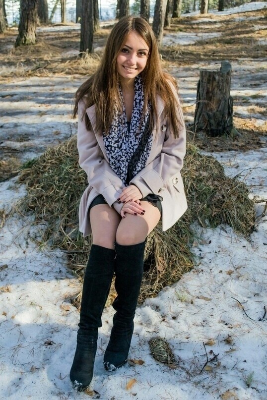 Высокие чёрные сапоги подчёркивают её стройность, гармонично вписываясь в этот образ современной грации. Её поза — расслабленная, но изящная: руки аккуратно сложены на коленях, а ноги чуть согнуты, будто она готова в любой момент вскочить и пуститься в весёлый бег по лесной тропинке.
