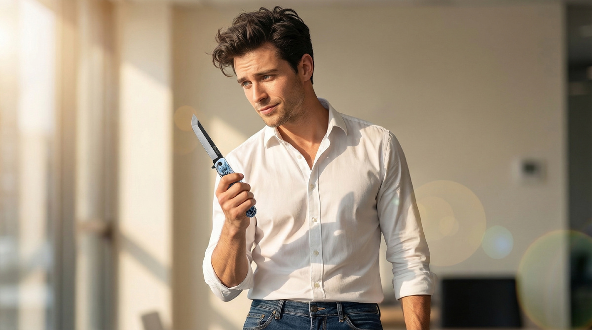 Форм-фактор «щепка» делает нож плоским настолько, что в кармане джинс он ложится вдоль шва и не создаёт объёма. В тонких летних брюках это единственный нож, который не заставляет проверять, не оттянулся ли карман.