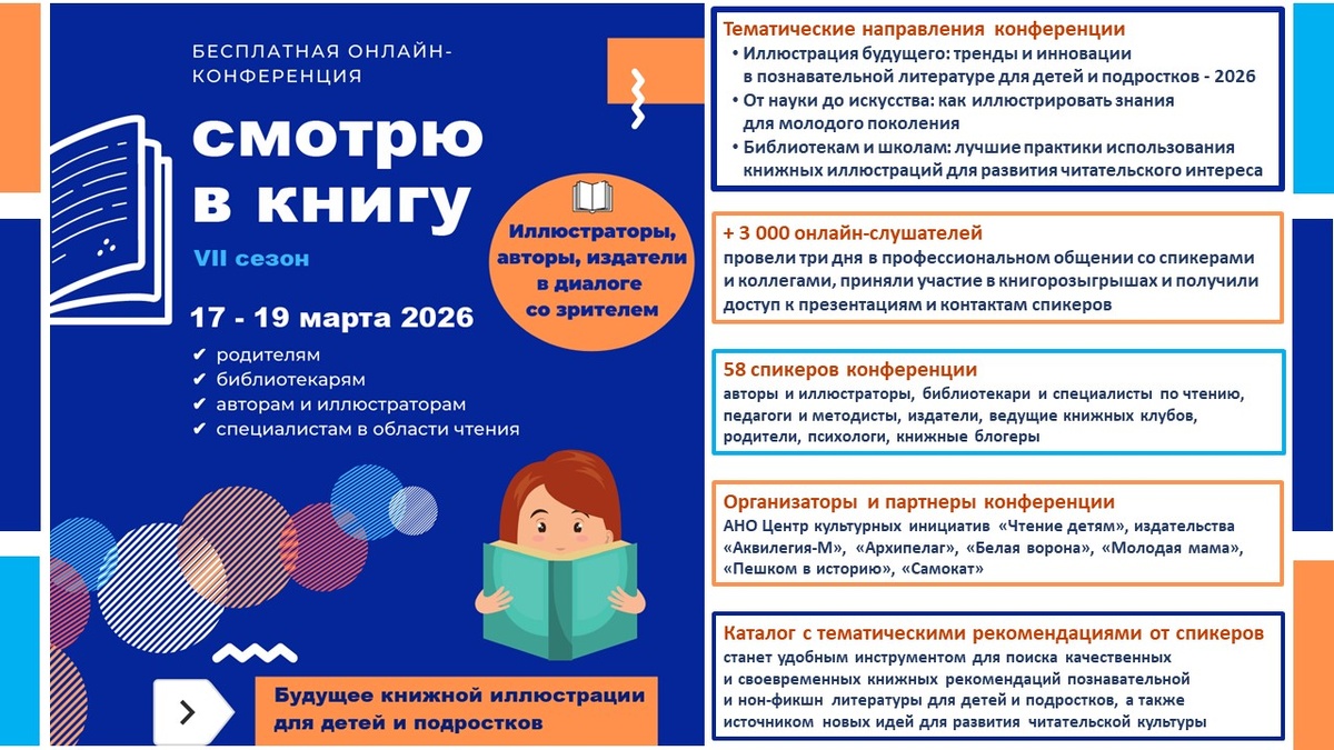 Уважаемые коллеги, представляем вашему вниманию итоги практической онлайн-конференции «Смотрю в книгу», проходившей с 17 по 19 марта 2026 г. и собравшей более 3000 участников: авторов, иллюстраторов и издателей, библиотекарей, педагогов и родителей, руководителей книжных клубов и представителей культурных учреждений России и других стран. В фокусе внимания «Смотрю в книгу» в 2026 году – познавательные и нон-фикшн книги для детей и подростков, роль иллюстрации в научной и образовательной деятельности, а также лучшие практики использовании книжных иллюстраций для развития читательского интереса в школе, библиотеке и семейном чтении. Сайт мероприятия: https://bookconf.ru/smotry_v_knigy_2026