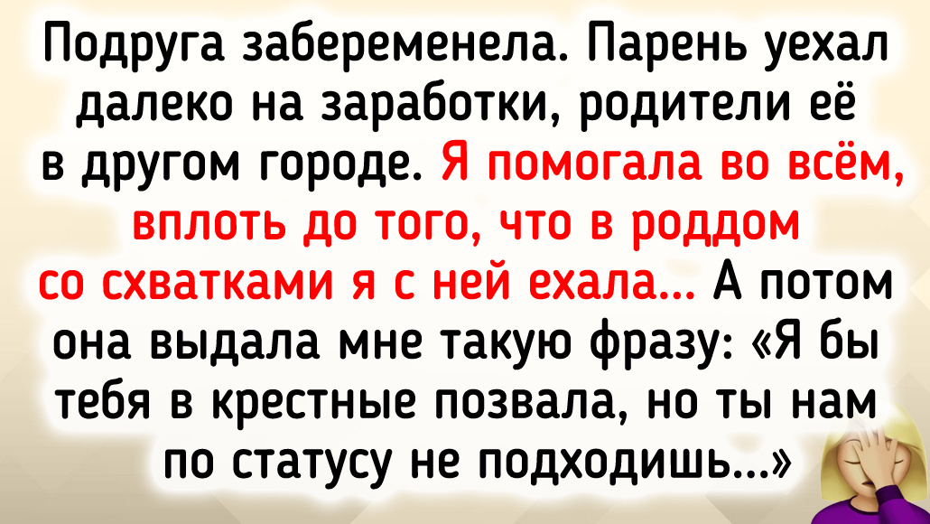 Подруга забеременела. Парень уехал далеко на заработки, родители ее в другом городе. Я помогала во всем, вплоть до того, что в роддом со схватками я с ней ехала. Потом она выдала мне такую фразу: «Я бы тебя в крестные позвала, но ты нам по статусу не подходишь...» © zajka.mozajka / Pikabu