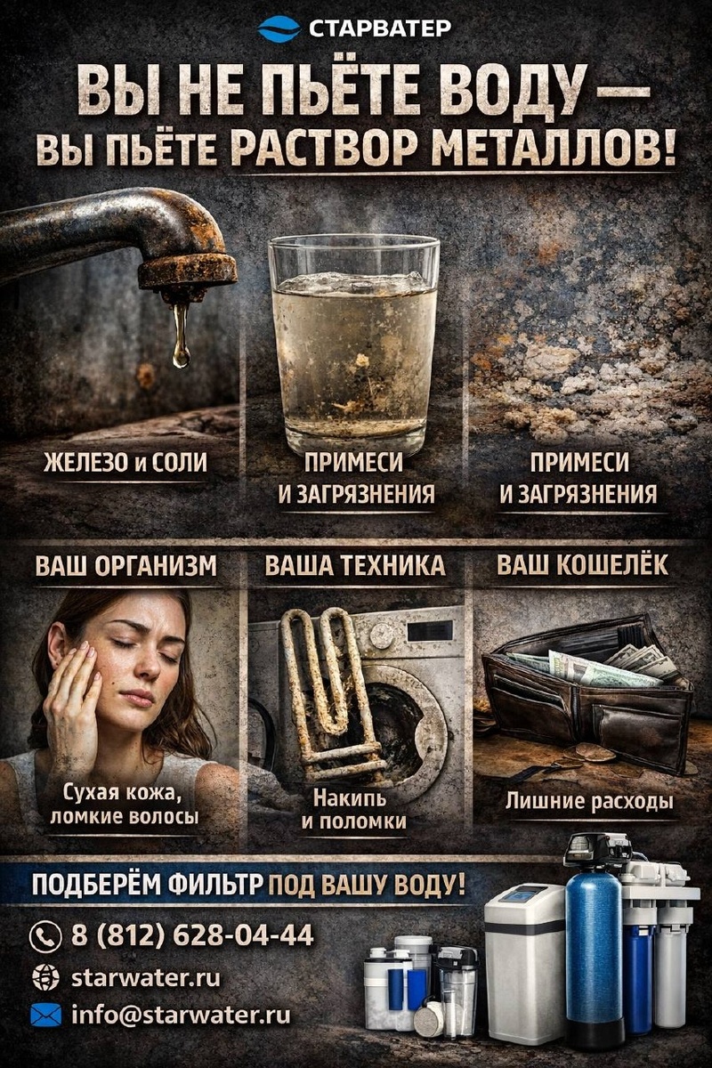 » Звучит жёстко? Но это реальность, с которой мы сталкиваемся каждый день. Откройте кран — и вместе с водой вы получаете: 👉 железо (тот самый рыжий налёт в раковине) 👉 соли жёсткости (накипь в чайнике и на технике) 👉 примеси и загрязнения, невидимые глазу И это не просто «неприятно». Это влияет на всё: 🚿 Ваш организм Сухая кожа, ломкие волосы, неприятный вкус воды — это только начало. Постоянное употребление такой воды может нагружать организм и ухудшать самочувствие. 🔧 Ваша техника Бойлеры, стиральные машины, чайники — всё страдает от накипи и отложений. Итог: поломки и лишние расходы. 💸 Ваш кошелёк Ремонт техники, покупка бутилированной воды, замена сантехники — всё это можно было избежать. ⸻ ⚠️ Но есть хорошая новость: Вы можете контролировать качество воды в своём доме. Мы в СТАРВАТЕР подбираем системы очистки под ваш состав воды, а не «наугад». Сначала анализ — потом решение, которое реально работает. ⸻ 📞 Телефон: 8 (812) 628-04-44 🌐 Сайт: starwater.ru ✉️ Почта:
