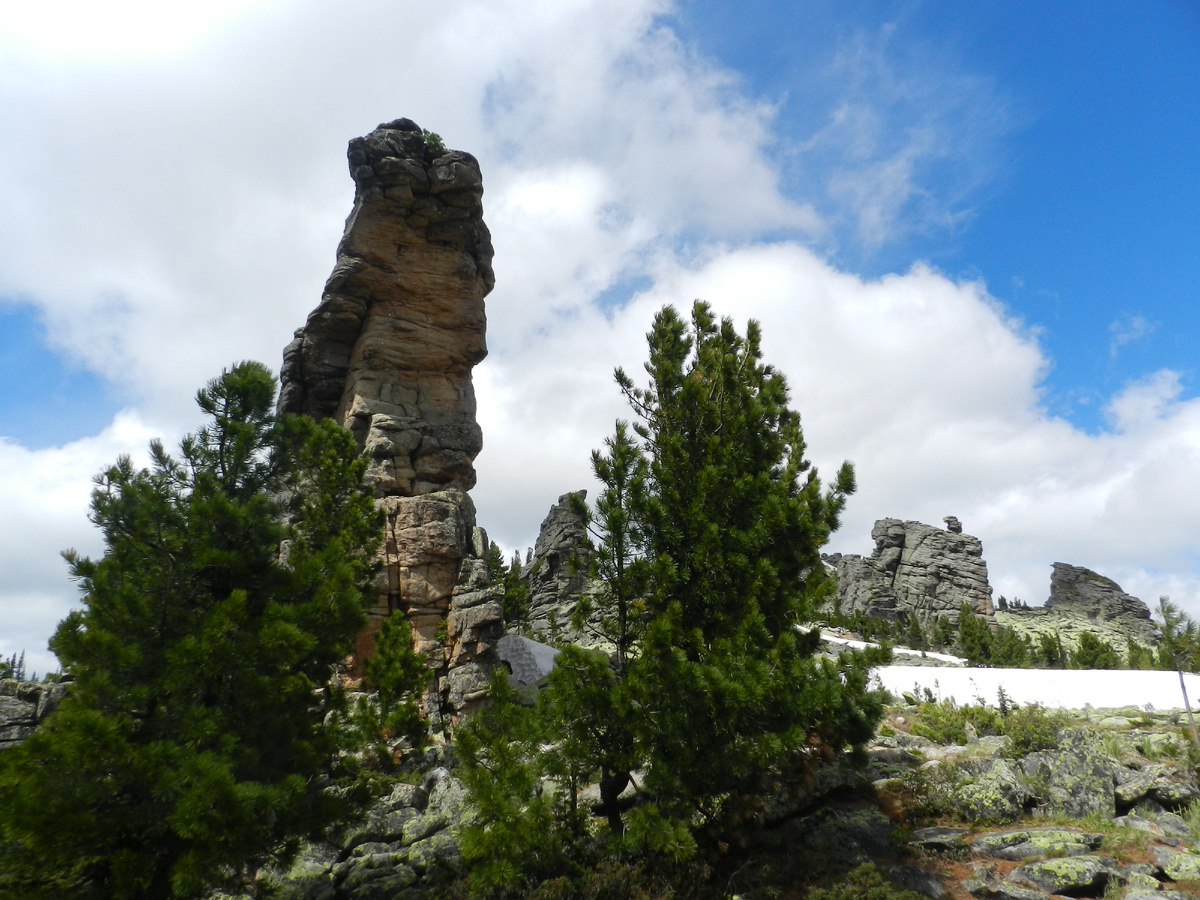 После вкусного обеда мы устремились с горы. Спустились очень быстро, практически скатились по снегу, помогая трекинговыми палочками. Решили не повторять прежних ошибок и как можно меньше скакать по курумам, а придерживаться тропинок. Останцы теперь мы рассматривали более обстоятельно, выискивая интересные формы и фигуры. Замечаю, что в одном и том же останце с разных точек можно разглядеть совершенно разных животных или другие ассоциации. Это довольно увлекательное занятие. По пути встречаются шикарные места для стоянок. Невольно в голову приходит мысль, что надо бы посетить эти места с палаткой и с ночевкой, а лучше с несколькими ночевками.