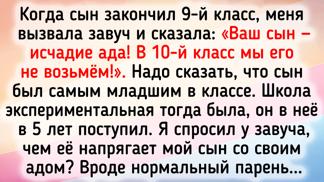 Когда сын закончил 9 класс, меня вызвала завуч и сказала: «Ваш сын — исчадие ада! В 10 класс мы его не возьмём!». Надо сказать, что сын был самым младшим в классе. Школа математическая, экспериментальная тогда была, он поступил в неё в 5 лет. Я спросил у завуча, чем её напрягает мой сын со своим адом? Вроде нормальный парень. Она в ответ, что если мы дадим ей 500 баксов, то всё будет нормально. Я отказался. Чуть позже ребёнок поступил в университет. © Олег Лазарев / Dzen