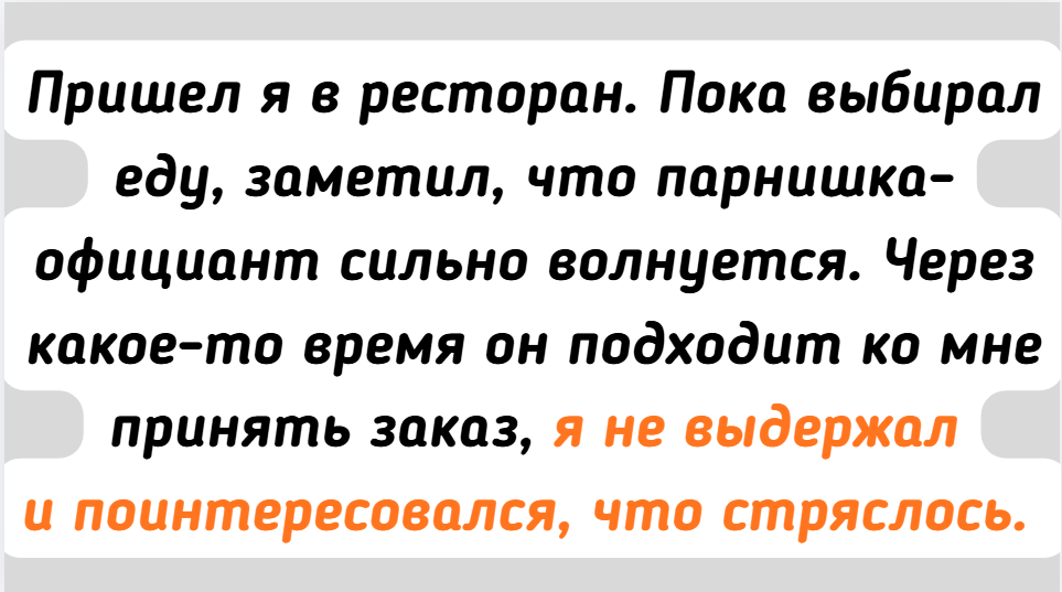 - Пришел я в ресторан. Пока выбирал еду, заметил, что парнишка-официант сильно волнуется. Через какое-то время он подходит ко мне принять заказ, я не выдержал и поинтересовался, что стряслось. Он признался, что давно хотел устроиться именно в этот престижный ресторан, сегодня у него первый рабочий день, за ним наблюдает администратор. Я проработал в похожем ресторане почти 10 лет. Почему бы и не помочь? Пока паренек принимал мой заказ, я дал ему пару толковых советов, указал на ошибки, а когда он принес еду, еще немного фишек и лайфхаков подсказал. К концу вечера парень аж расцвел и просто порхал по залу с легкой улыбкой и уверенностью в глазах. Как же все-таки приятно кому-то передавать свои знания и потом видеть этот рост.