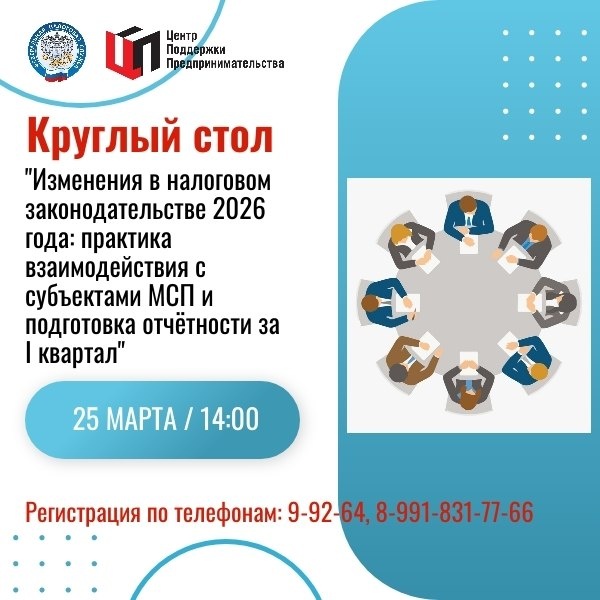 25 марта в 14:00 в Центре поддержки предпринимательства пройдёт круглый стол «Изменения в налоговом законодательстве 2026 года» Эксперты налоговой службы расскажут о новых ставках НДС, лимитах для спецрежимов, страховых взносах, особенностях взаимодействия с налоговой, правилах подготовки отчётности за первый квартал, о пониженных ставках для УСН и многом другом. Участники смогут задать вопросы и получить практические рекомендации. Регистрация по телефонам: 99263, 99264, 89918317766 или по ссылке: https://forms.yandex.ru/cloud/69bd232a493639655daf07ca/ Не упустите шанс быть в курсе всех изменений и обеспечить стабильность вашего бизнеса.