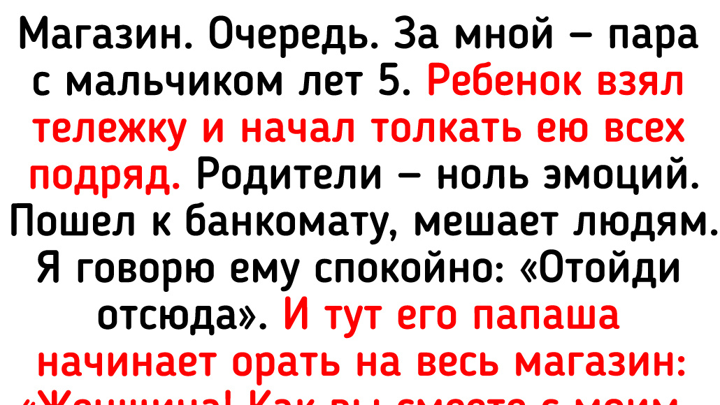 Магазин. Очередь. За мной — пара с мальчиком лет 5. Ребенок взял тележку и начал толкать ею всех подряд. Родители — ноль эмоций. Пошел к банкомату, мешает людям. Я говорю ему спокойно: «Отойди отсюда». И тут его папаша начинает орать на весь магазин: «Женщина! Как вы смеете с моим ребенком так разговаривать?! Женщина! Я к вам обращаюсь!» Я думала, он сейчас на меня бросится. © маруся иванова / Dzen