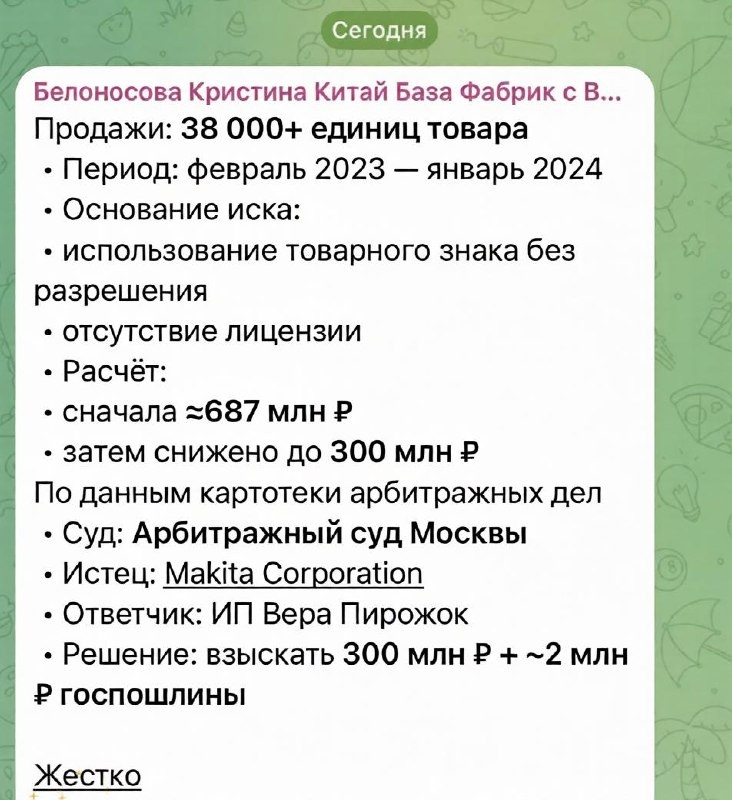 Японская компания добилась взыскания с предпринимательницы из Удмуртии, продавшей около 38 тысяч товаров по средней цене 9 тыс. рублей. Изначально иск превышал 680 млн рублей, но сумму снизили до 300 млн – суд полностью поддержал правообладателя. ⚡️ Первый Бизнес в MAX