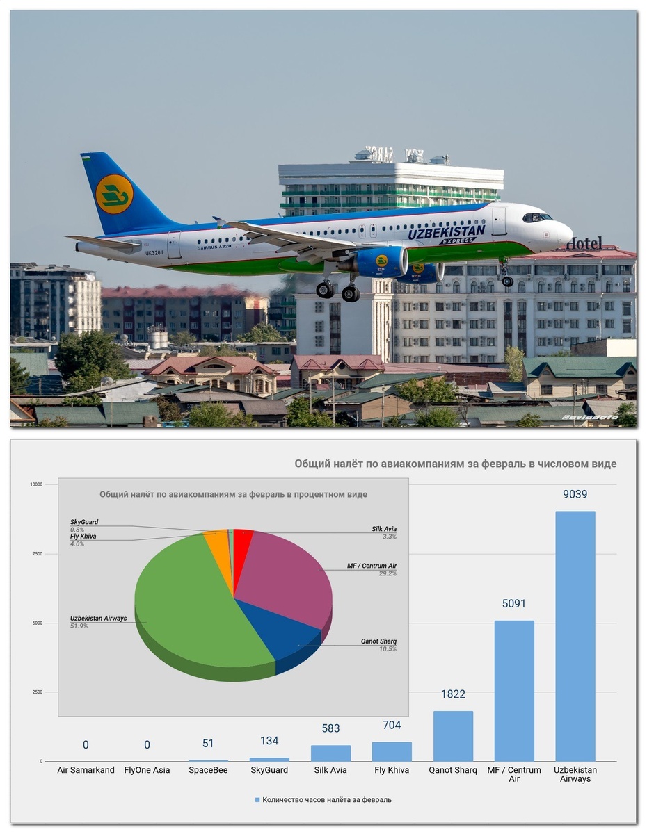 На графике представлен общий налёт по авиакомпаниям за февраль, выраженный в числовом (часы налёта) и процентном виде (какую долю составляют эти часы от суммарного числа налёта всех авиакомпаний страны за февраль). У авиакомпаний Air Samarkand и FlyOne Asia самолёты, находящиеся в сухом лизинге проходят техническое обслуживание и полётов не совершали, поэтому там часов налёта нет, летают только те, что в мокром лизинге #acmi. #статистика #февраль2026