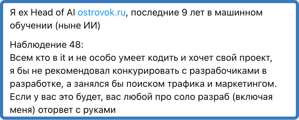 Можно сказать другими словами - умение продавать (лидген делать) - самое важное в ИТ в наши дни (если только вы не имеете долгосрочные контракты с гос.заказчиком)... Почитайте на картинке, мнение на 100% верное. @clickfraud.ru