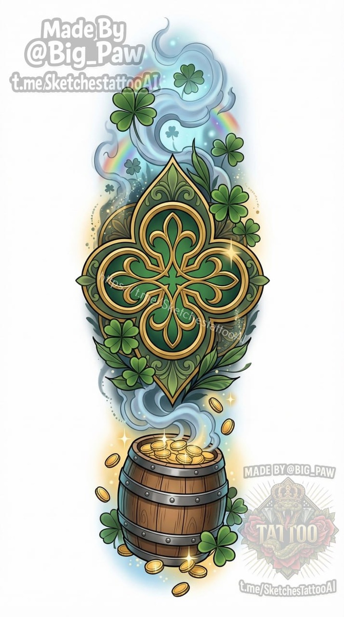 #2933 Подборка по запросу подписчика - У парня клевер набит 7 см в длину на внутренней части предплечья. Хочет развить идею полурукава с темой лепрекона и лепрекона женщины или двух женщин. Снизу нужен боченок с золотом. Эскиз цветной, делаем в неотраде или графике. Хочется композиционную целостность и для контр-ажура голубого неба может… 🧠 SYNTX - тут создан эскиз 💎 Информация - все услуги 💀 Эскизы от нейросети 😎 Удалить тату - прайс #лепрекон #рукав #цветная #эскиз #тату #татуировка