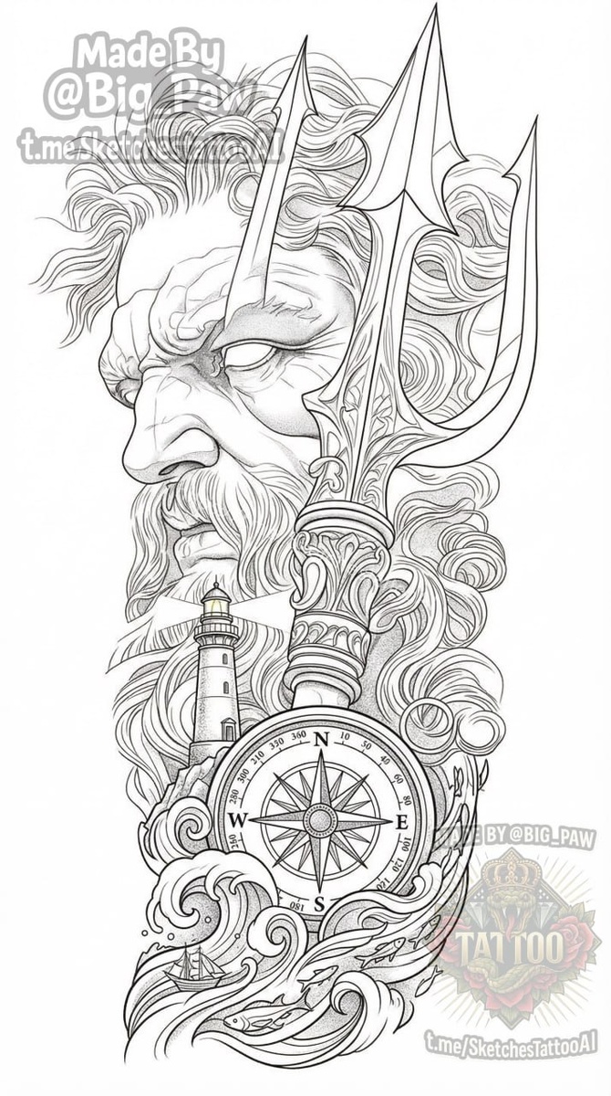 #2934 Подборка по запросу подписчика - Привет, прошу пожалуйста. Изобразить татуировку Ч/Б (белый фон) от плеча до локтя. Изобразить морскую тематику во главе должен быть Посейдон с трезубцем, а ниже другие морские объекты (волны, маяк, компас) ОСЬМИНОГА НЕ НАДО. Стиль графика. Пример с расположением похожий , но не то и пример Посейдона. 🧠 SYNTX - тут создан эскиз 💎 Информация - все услуги 💀 Эскизы от нейросети 😎 Удалить тату - прайс #посейдон #графика #цветная #эскиз #тату #татуировка