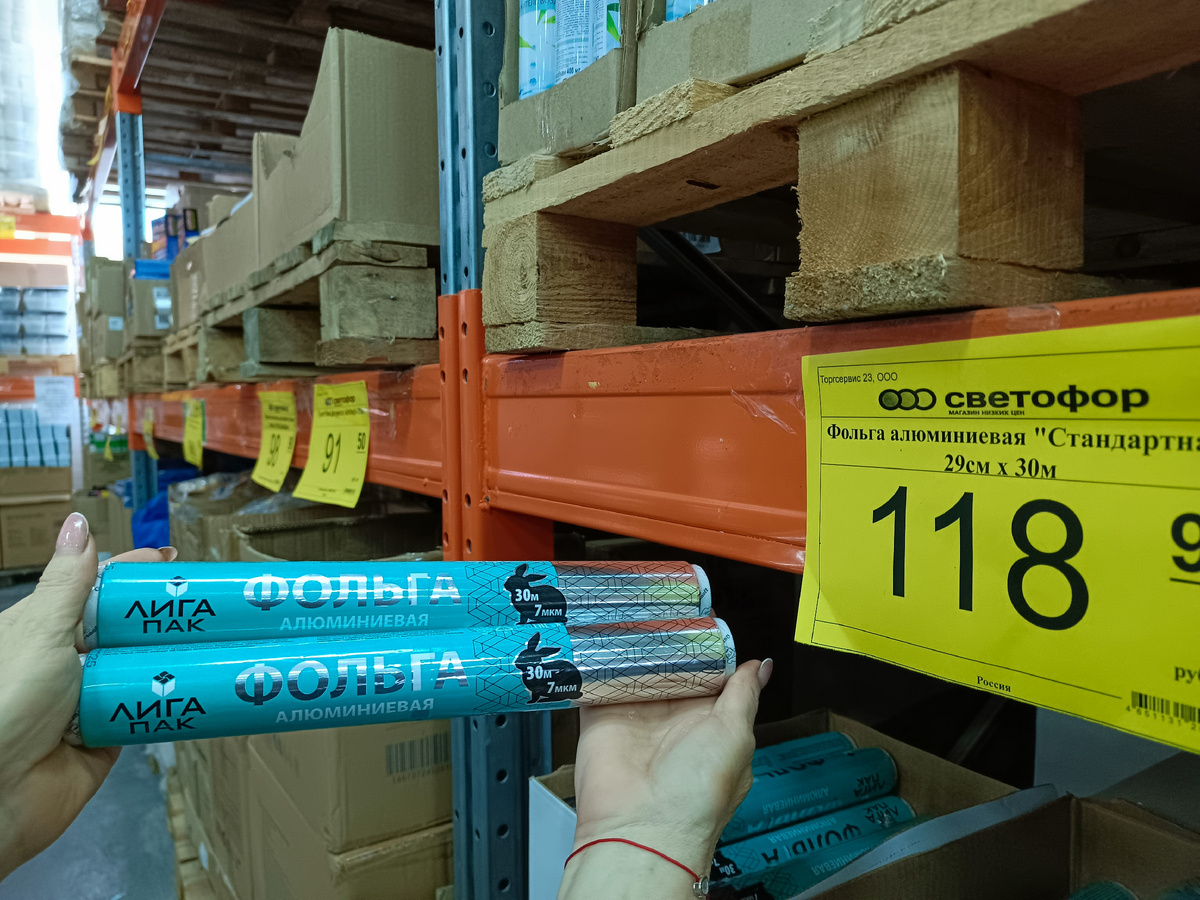Алюминиевая пищевая фольга шириной 29 см, в рулоне 30 метров. Она отлично подходит для запекания, хранения продуктов в холодильнике или морозильной камере, а также для упаковки готовых блюд. Цена 119 рублей.