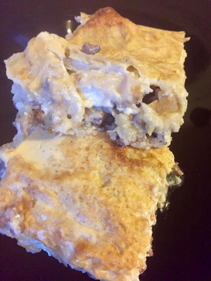 ✔ Лаваш цельнозерновой с отрубями — 150 г (≈3 листа); ✔ Фарш говяжий — 400 г; ✔ Лук —1 шт.; ✔ Чеснок —1 зубчик; ✔ Творог 5% — 200 г (лучше 400); ✔ Травы сушеные (прованские, орегано) — 1 ч. л.; ✔ Соль, перец — по вкусу; ✔ Кефир 2,5% — 400 мл; ✔ Яйца — 3 шт.; ✔ Масло растительное — 1,5 ч. л. (для смазывания формы). Фарш с луком и чесноком обжариваем на сковороде очень быстро, чтобы не стал сухой. В творог добавляем травы, соль. Заправка - хорошо перемешиваем кефир и яйца. Лист лаваша с «бортиками» кладём на смазанное дно формы. Затем слой фарша, творога, лист лаваша (нарезанный по размеру формы, без «бортиков»), фарш, творог, лаваш и так далее. Верхний слой - лаваш. Хорошо, если слоев будет 4 или больше. Дальше закрываем «бортики», и делаем надрезы до дна. Заливаем кефирно-яичной смесью. Ставим в разогретую до 190 градусов духовку минут на 25. КБЖУ на 100 г – 145/12,0/7,3/7,7 (из них крахмала – 4,5 г, клетчатки 0,8 г, остальное - лактоза). + 6 фото Автор рецепта – Alexey Sorokin Рецепт