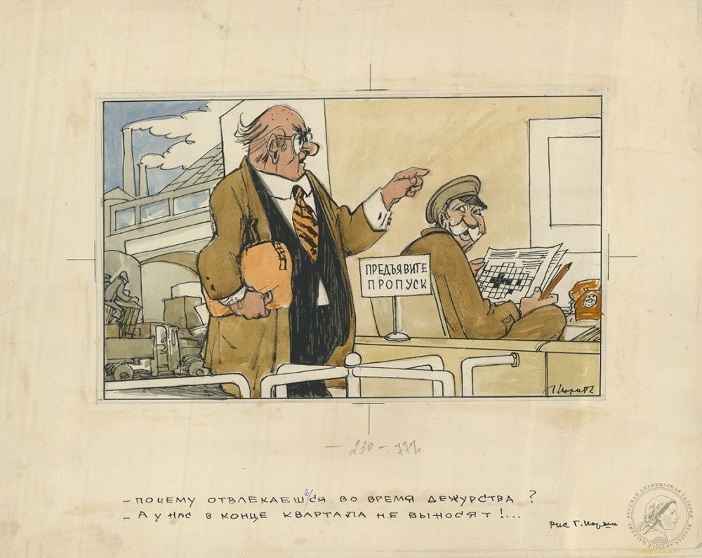 Сайт: rus-gal.ru #Иорш Г. С. #Карикатура «Предъявите пропуск» для журнала «Крокодил №18» #СССР, 1980 год. Бумага, акварель. 42,5 Х 33,6 см #Карикатура #Советская_графика Подробнее https://rus-gal.ru/works/karikatura-predyavite-propusk-dlya-zhurnala-krokodil-18/