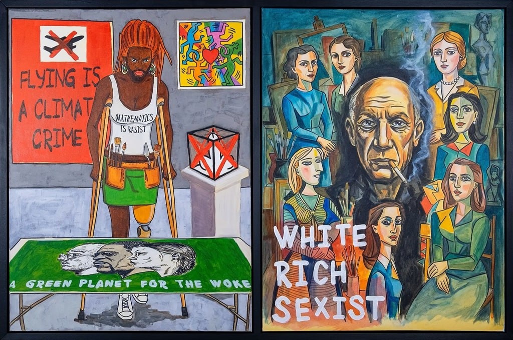 В обзоре Евгения Наумова на творчество художника TuRisT рассматривается диптих «Художники с идеальной и неидеальной биографиями». Левая часть представляет собой темнокожую трансгендерную художницу с протезом ноги и дредами в майке с надписью «Mathematics is racist», чьё творчество становится служением обществу через плакаты о климатических преступлениях и портреты активистов; несмотря на лапидарность работ, «правильная» биография помогает ей заполнять музейные лакуны меньшинств. Правая часть — доминирующий белый мужчина, классический «патриарх» и токсичный гений, чья фигура подавляет окружающих женщин, а надпись «WHITE RICH SEXIST» служит кратким пересказом биографии, игнорируя тот факт, что Пабло Пикассо был эмигрантом, презираемым французским бомондом. Зрителю предлагается самостоятельно решить, какая биография идеальна — та, что обеспечила долгую обеспеченную жизнь и место в истории, или та, что безупречна с точки зрения социальной справедливости и обеспечивает успех прямо сейчас.