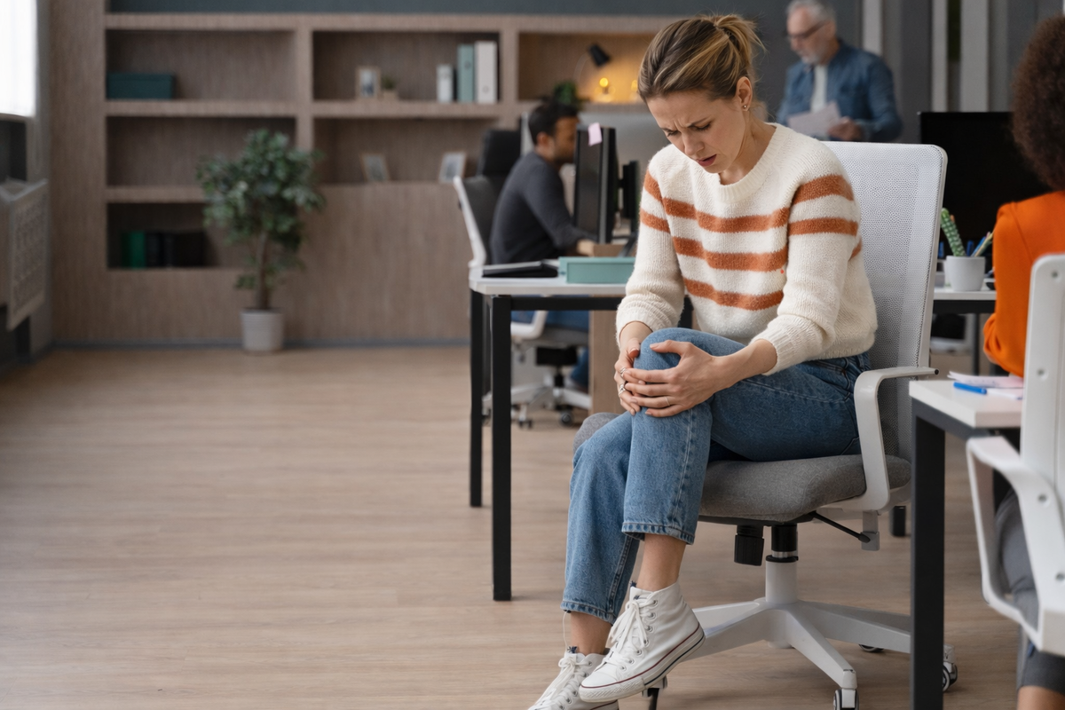 Длительное сидение за компьютером с редкими перерывами и недостаток физической активности оказывают влияние на здоровье суставов. Одним из частых последствий такого образа жизни становится «синдром офисного колена», о котором мы расскажем подробнее в статье. «Синдром офисного колена» — это неформальное название для боли или дискомфорта в коленях. Это состояние не является самостоятельным заболеванием, но включает в себя комплекс симптомов: Синдром развивается постепенно. Сначала дискомфорт появляется только к концу рабочего дня и проходит, когда сустав «разрабатывается». Со временем неприятные ощущения могут возникать и в других ситуациях. Если симптомы сохраняются долго, боль в суставах усиливается, появляется краснота или температура — необходимо срочно обратиться ко врачу. Главная причина развития синдрома офисного колена связана с особенностями современного образа жизни. Коленный сустав — один из самых крупных и сложных суставов человеческого организма. Он рассчитан на движение и