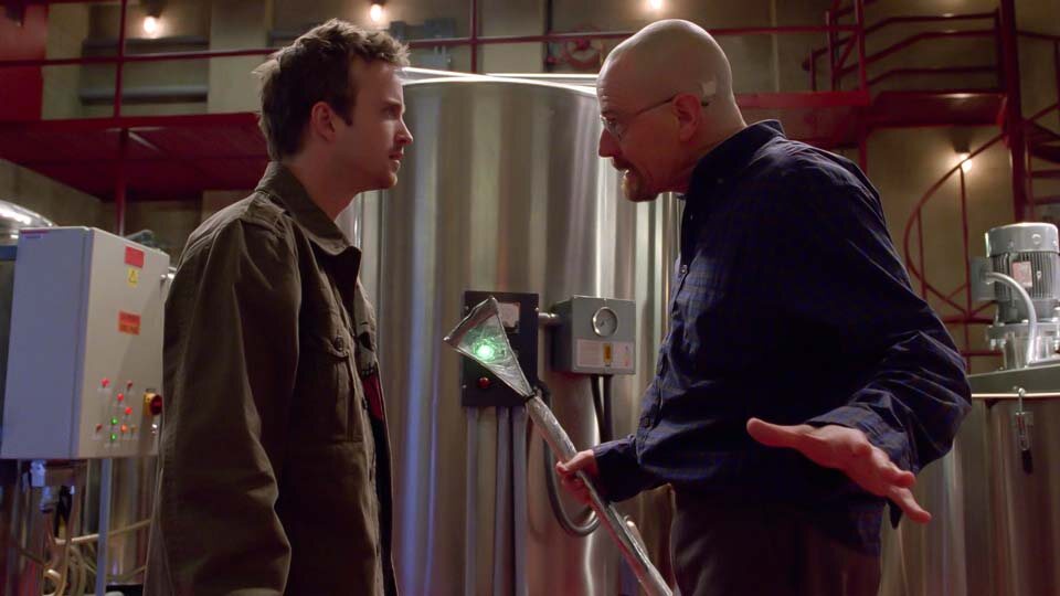 Сериал вообще не доверяет словам. Персонажи могут врать, оправдываться, кричать — камера всё равно покажет правду. И делает это так, что мурашки по коже. Помните пилотную серию? Уолт в подвале, Крэйзи-8 без сознания. Уолт смотрит на тарелку на полу. Камера смотрит вместе с ним. Потом кадр меняется — тарелки нет. И ты понимаешь: он не просто без сознания, он взял осколок и ждёт. Без единого слова. Без крика. Просто взгляд и тарелка. С этого момента сериал установил правило: смотри на предметы. Они расскажут больше, чем герои. В первых сезонах Уолта часто снимают сверху. Он маленький, сжатый, зажатый в углу кадра. Он на периферии собственной жизни. Потом камера начинает опускаться. В сцене, где Уолт говорит «Я — тот, кто стучится», объектив уже снизу. Он огромен, он заполняет собой весь экран. Он стал Гейзенбергом. Но сериал не был бы гениальным, если бы на этом остановился. В финале, когда Уолт умирает в лаборатории, камера снова смотрит на него сверху. Круг замкнулся. Гигант снова стал