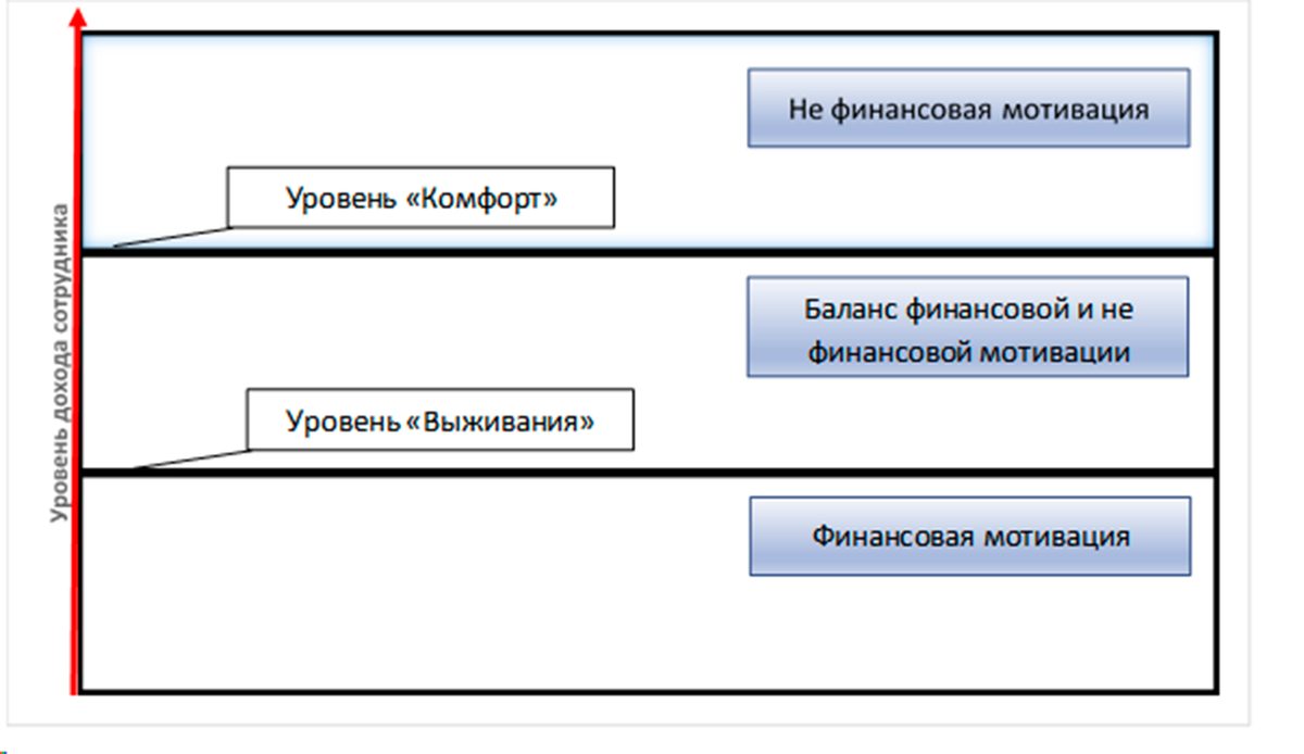 Некоторое время назад затронул тему мотивации в этой статье Ка и обещал пишу о том, как понять мотивацию подчиненного В бизнесе смешаны два понятия – финансовая стимуляция и энтузиазм сотрудника при выполнении той или иной работы. Большинство людей уверены, что деньги - основной мотив. Это справедливо, но далеко не для всех. В каких случаях это так? В этом нам поможет разобраться модель «Личный уровень дохода сотрудника» Смотри изображение к статье Уровень «Выживания». Как понятно из названия – это тот уровень дохода, которого человеку едва хватает на жизнь. Это планка сотрудника, на доход ниже которой сотрудник не согласится. У каждого этот уровень свой. Кому-то хватает 20 тыс. руб., а кому-то 100 тыс. руб. Уровень «Комфорта». Тот уровень дохода, когда сотруднику достаточно денег на комфортную жизнь. Достигнув этого уровня, сотрудник перестает напрягаться, и его очень сложно сдвинуть. Это то, что называют «потолок по доходам». До и на уровне «Выживания» ( +/- 10%) человек будет стре