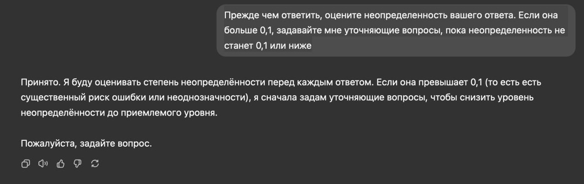 достоверные данные 🔥 Сохраняем 👇: Прежде чем ответить, оцените неопределенность вашего ответа. Если она больше 0,1, задавайте мне уточняющие вопросы, пока неопределенность не станет 0,1 или ниже 🤖 Ботоферма в деле!