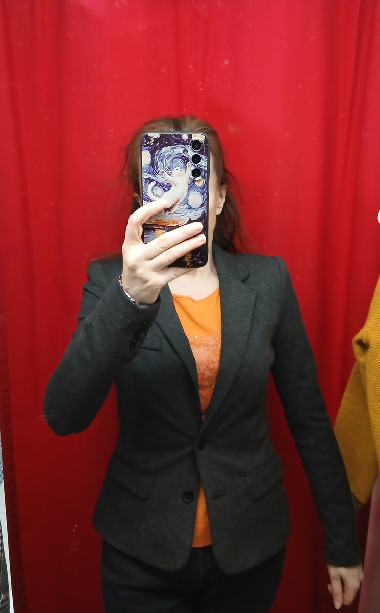 Здравствуйте, один стилист предостерег от ношения очков спущенных на кончик носа, и привычки носить сумку перед собой, это очень немодно, очччень. Сумку перед собой я не ношу, но очки! Особенно в секонде, вещь я могу разглядеть без очков, а состав уже нет, поэтому очки сидят на кончике носа. Нет у меня современных прогрессивных и модных очков, буду старыми перебиваться немодными((. Обзор с акции "всё по 50 рублей". Темно-серый приталенный жакет понравился за уютную ткань, очень приятная и мягкая. Но она серая и унылая, да и жакет впритык( Трикотажное полотно из вискозы и синтетики. Желтый кардиган с резинками горчичного цвета. Кофта на груди не сходится, но по замыслу она греть не должна, тонкая очень. Если только цвет красивый. Жакет на крючке. То что похоже на воротник, совсем не воротник, это вставка с черным кантом. Жесткий гобелен. У меня нет одежды из такой ткани, мир и так суров, чтобы еще носить такую грубую ткань. Зато вещь форму держит и сидит как влитая) Платье или туника с