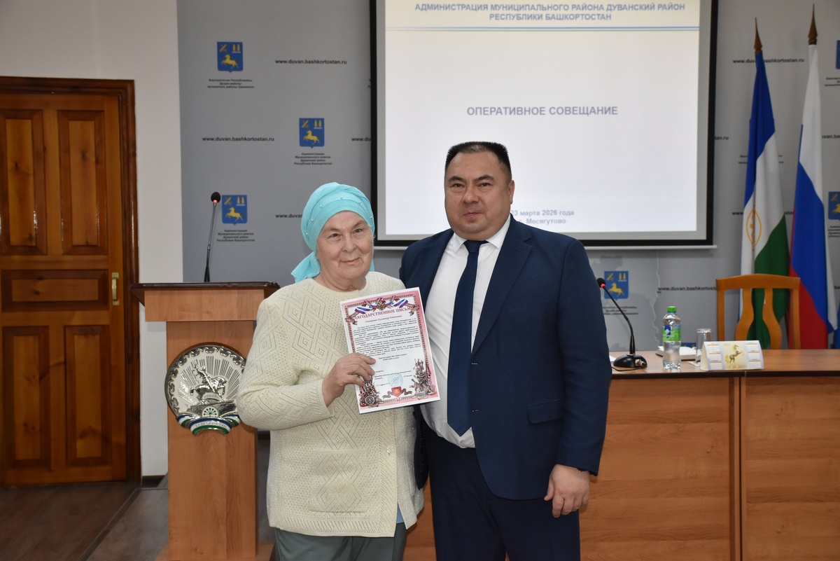 Сегодня на оперативном совещании Администрации муниципального района Дуванский район Республики Башкортостан глава муниципалитета Айдар Абдуллин вручил благодарственное письмо Мухамадеевой Гильминур Гайнановне из села Новый Бердяш. Благодарность от командира воинской части была адресована матери и супруге нашего земляка - Хисамова Азата Ратмировича. Азат Ратмирович с 26 апреля 2023 года достойно исполняет воинский долг, проходя службу по контракту в зоне СВО. Фото : прес-служба админисрации Дуванского района.