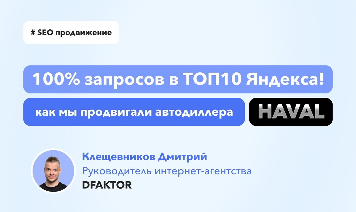 О проекте Клиент: Официальный дилер Haval (haval-yug.ru). Ниша: Продажа новых автомобилей. Регион: Санкт-Петербург. С чем пришел клиент Автомобильный рынок в Петербурге — это традиционно перегретый аукцион и жесточайшая конкуренция за каждого клиента в органике. Перед нами стояла амбициозная задача: вывести сайт дилера в ТОП Яндекса по 136 высококонкурентным коммерческим запросам («купить Haval», «Haval Jolion цена», «Haval F7 купить», «официальный дилер Haval СПб» и так далее). На старте позиции сайта оставляли желать лучшего: всего 0,74% нужных запросов находились в ТОП-3. 📌 Кстати, о том, как алгоритмы Яндекса меняются в этом году и какие связки работают лучше всего в высококонкурентных нишах, мы регулярно пишем в нашем Telegram-канале DFAKTOR Как мы это исправили: 3 шага к ТОПу Мы не стали переделывать сайт с нуля, а сфокусировались на точечной доработке текущих страниц и мощной прокачке пользовательского опыта. Оптимизация существующего контента Мы грамотно распределили все 136