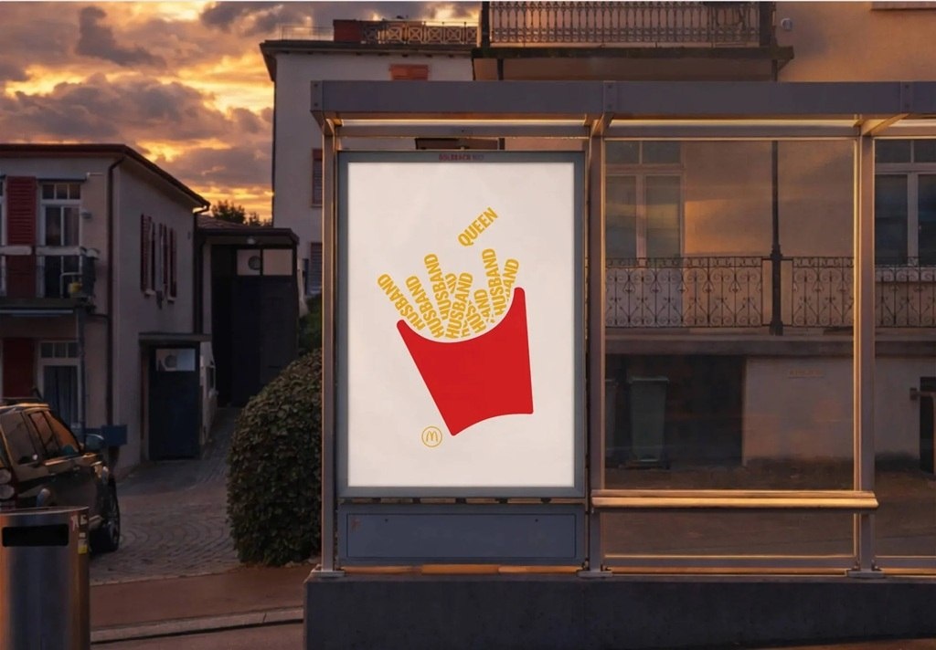 изображён рассыпанный картофель фри в фирменной упаковке, но сам продукт заменён словами — «королева», «сосед», «тренер», «таксист», «чайка», «дедушка» и «Рейчел» (отсылка к героине сериала «Друзья»), — чтобы подчеркнуть, что перед картофелем фри невозможно устоять и всегда найдётся тот, кто осмелится его украсть; в McDonald’s отмечают, что такой подход без фуд-порна укрепляет эмоциональную связь с потребителем, а остроумная игра форм и цветов создаёт визуальный язык, узнаваемый за доли секунды.