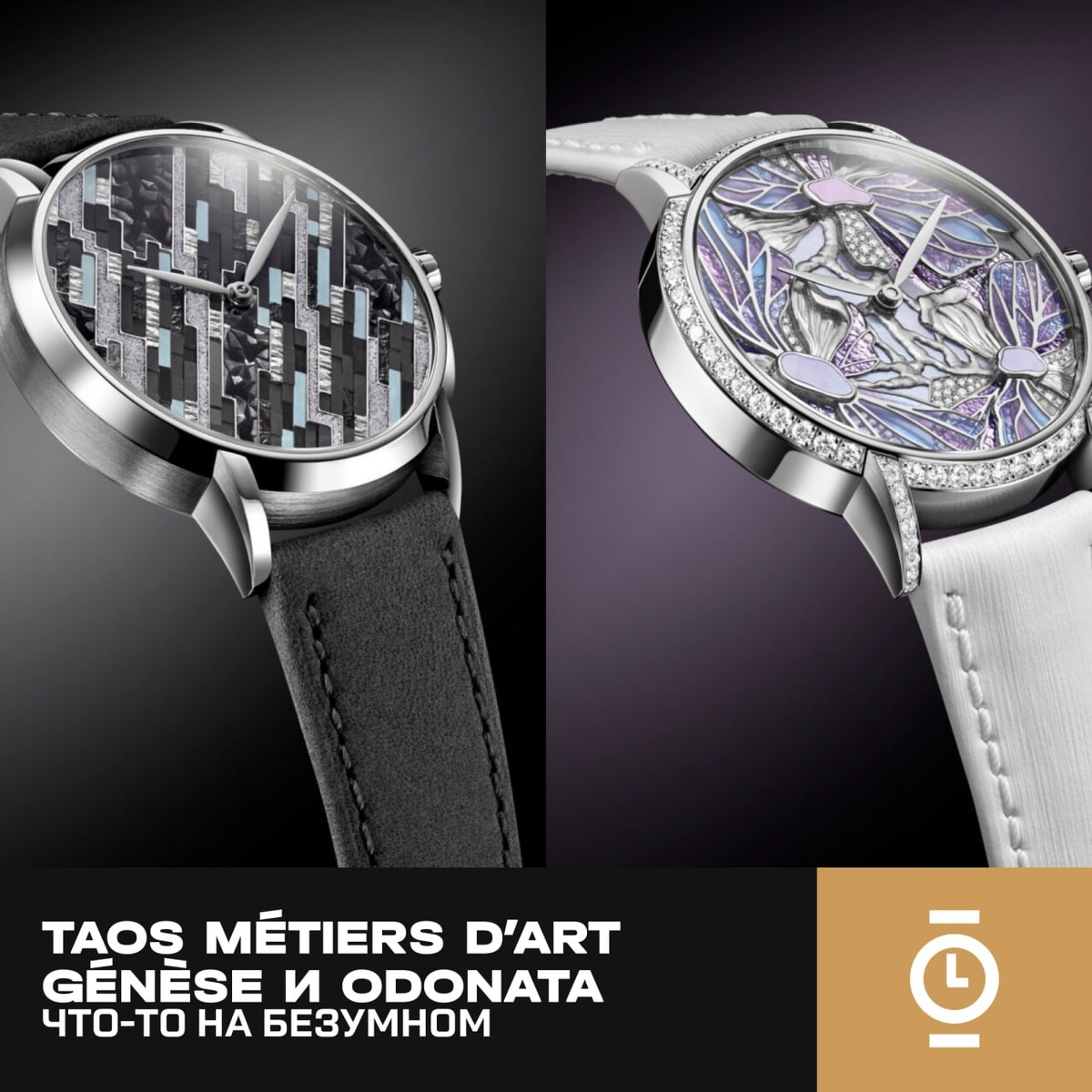 #новости_WD Женевское ателье TAOS, основанное в 2024 году под руководством Оливье Воше, представило две уникальные модели Métiers d’Art — Génèse и Odonata. Бренд опирается на опыт мастерской, объединяющей около 40 ремесленников и работающей для ведущих домов часового искусства. Модель Génèse вдохновлена минеральным миром. Циферблат выполнен с использованием сложной комбинации техник: гравировки под эмалью, горячей эмали (grand feu) и каменной маркетри с применением чёрного нефрита и синего агата. Внутри установлен механизм, разработанный компанией Telos (основана Франком Орни и Джонни Жирарденом). Калибр оснащён периферийным ротором, что позволяет использовать его как художественное пространство — отделка перекликается с оформлением циферблата. Корпус — белое золото, диаметр 38 мм. Вторая модель, Odonata, названа в честь стрекоз и представляет более сложную и фантазийную интерпретацию природы. Циферблат многоуровневый и объединяет высокорельефную гравировку, эмаль paillonné, инкруст