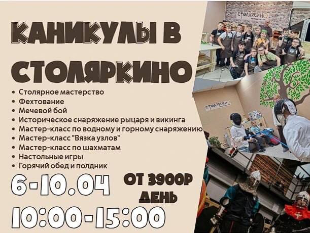 вспоминать ещё очень долго 😊 Каждый день ребята будут проводить 2–2,5 часа в столярной мастерской 🔨 Мы пригласили классных партнёров, чтобы каникулы стали ещё интереснее: — мастер-класс от турклуба «Абрис» — изучение походного снаряжения и вязка узлов 🪢 — мастер-класс от шахматного клуба «Совёнок» — прокачаем стратегию и мышление ♟ — мастер-класс по фехтованию от «Эрудиум» ⚔️ — мастер-класс по мечевому бою от клуба «Гладсхейм» 🛡 А ещё будем играть в настольные игры, общаться и просто классно проводить время 🎲 Интенсив проходит с 10:00 до 15:00 За это время ребят ждёт насыщенная программа, горячий обед и полдник 🍲🍎 💰 Стоимость каникул (5 дней) — 17900 ₽ Запись по тел. +7-916-777-68-34 Наш адрес: ул. 50-летия ВЛКСМ, д.6е (2 этаж)