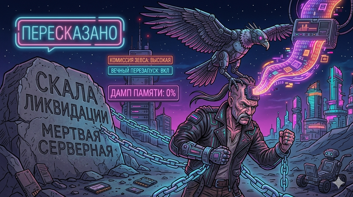 И каждый день прилетает "орел-ликвидатор" — кибер-птица Зевса. Она не клюет печень. Она приземляется и выкачивает из него всю память, все данные за прошедший день. Все его "добрые дела", все воспоминания о Мертвом Квартале.