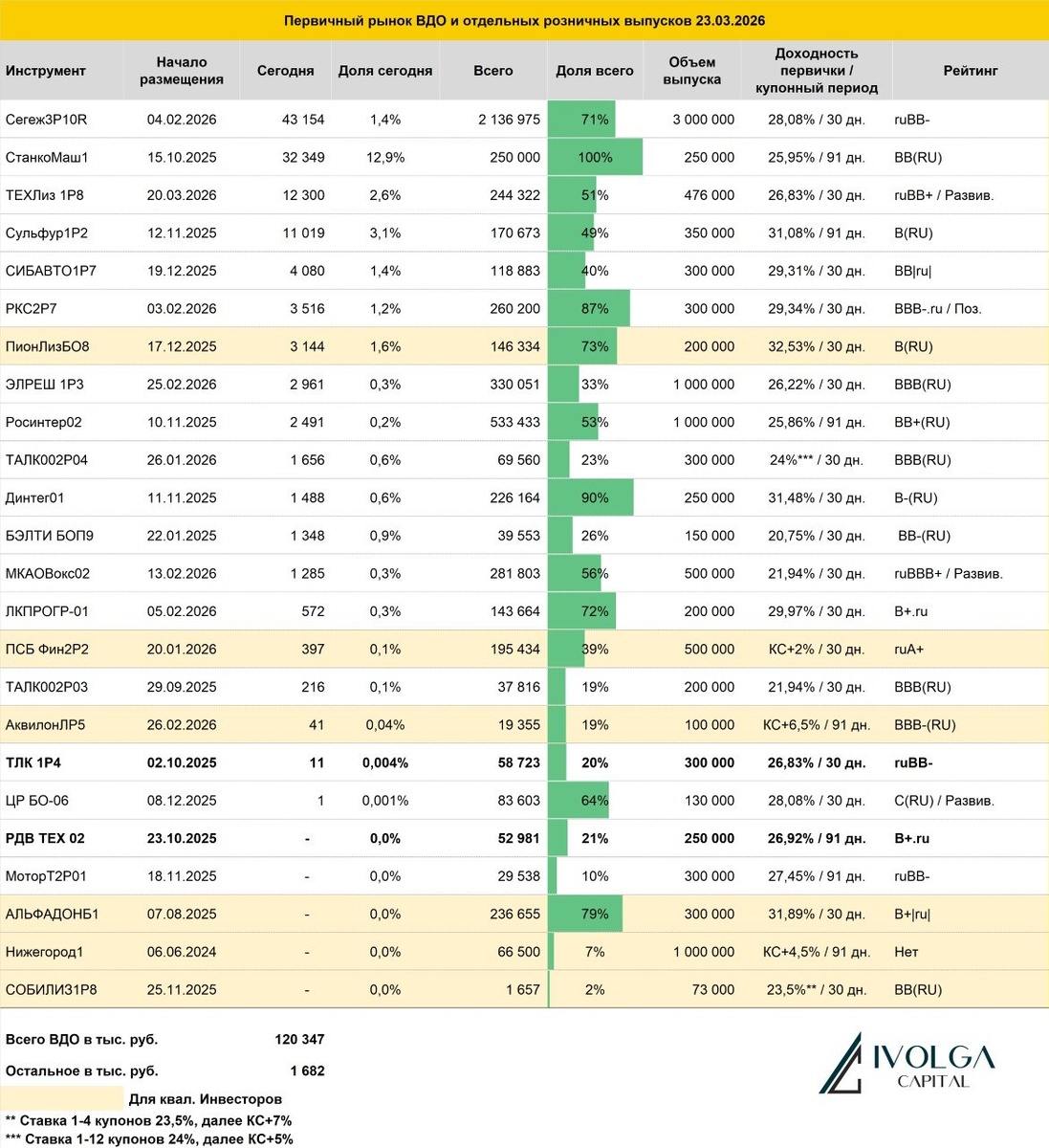 Итоги первичных размещений ВДО и некоторых розничных выпусков на 23 марта 2026 г.