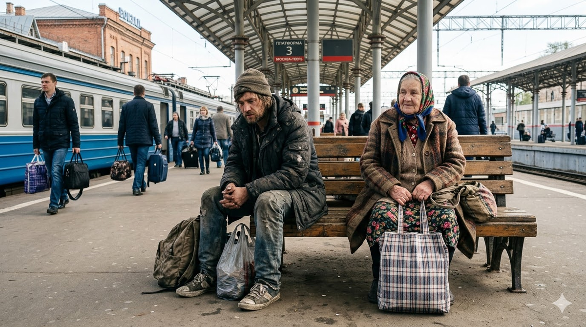 Раннее осеннее утро на провинциальном вокзале пробирало до самых костей. В тусклом свете люминесцентных ламп смешивались запахи сырости, дешевого растворимого кофе и застарелой человеческой усталости. На жестких деревянных скамейках в ожидании первых электричек дремали случайные пассажиры и бездомные. В самом углу зала, отрешенно глядя перед собой, сидел Егор. В его ногах лежал потертый целлофановый пакет — в нем умещалось абсолютно всё имущество, нажитое им к сорока пяти годам.