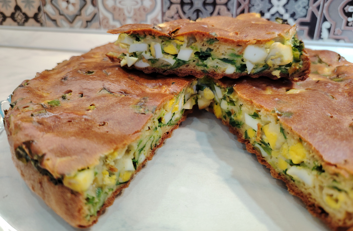Черемша имеют характерный чесночный вкус и аромат, похожий на запах чесночных стрелок. Особую ценность представляют молодые листья благодаря своей деликатности. По мере роста черемши острота становится более интенсивной. Сезон черемши очень короткий и хочется сполна насладиться салатами и закусками с этой зеленью. Предлагаю свой простой рецепт заливного пирога из черемши куриными яйцами. Для теста: Кефир - 250 мл Яйцо куриное - 2 шт. Сода пищевая - 1 ч. ложка (без верха). Соль - 0.5 ч. ложки Масло растительное рафинированное – 50-60 мл. Мука пшеничная – 200-220 гр. Для начинки: Яйцо куриное – 5 шт. Черемша – 100 гр. Соль – по вкусу 1. Подготавливаю все ингредиенты для пирога с черемшой и куриными яйцами на кефире. Яйца нужно заранее отварить, остудить и почистить. 2. Готовлю тесто для заливного пирога с черемшой и яйцами. В глубокую миску выливаю кефир. Жирность кефира не