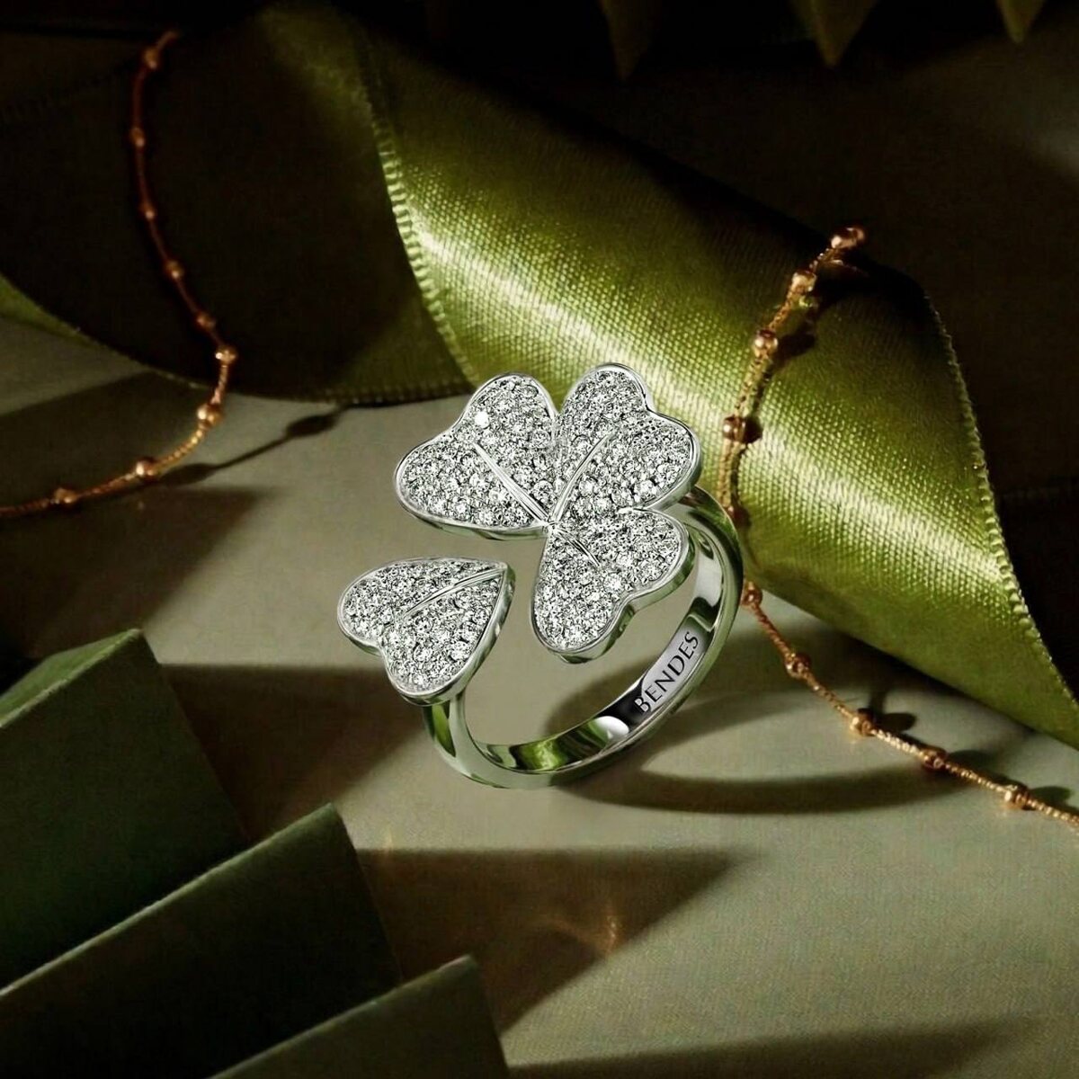 Четыре лепестка из бриллиантов. 116 камней, усыпанных так плотно, что золота почти не видно — только свет и форма. Клевер — символ, который понятен без слов. Удача, которую носят на руке. Кольцо для тех, кто верит, что хорошее притягивает хорошее. Белое золото, ручная закрепка каждого камня. Объёмная форма, которая ловит свет при любом движении. Записаться на примерку: @bendesdirect_bot Ref. 7007