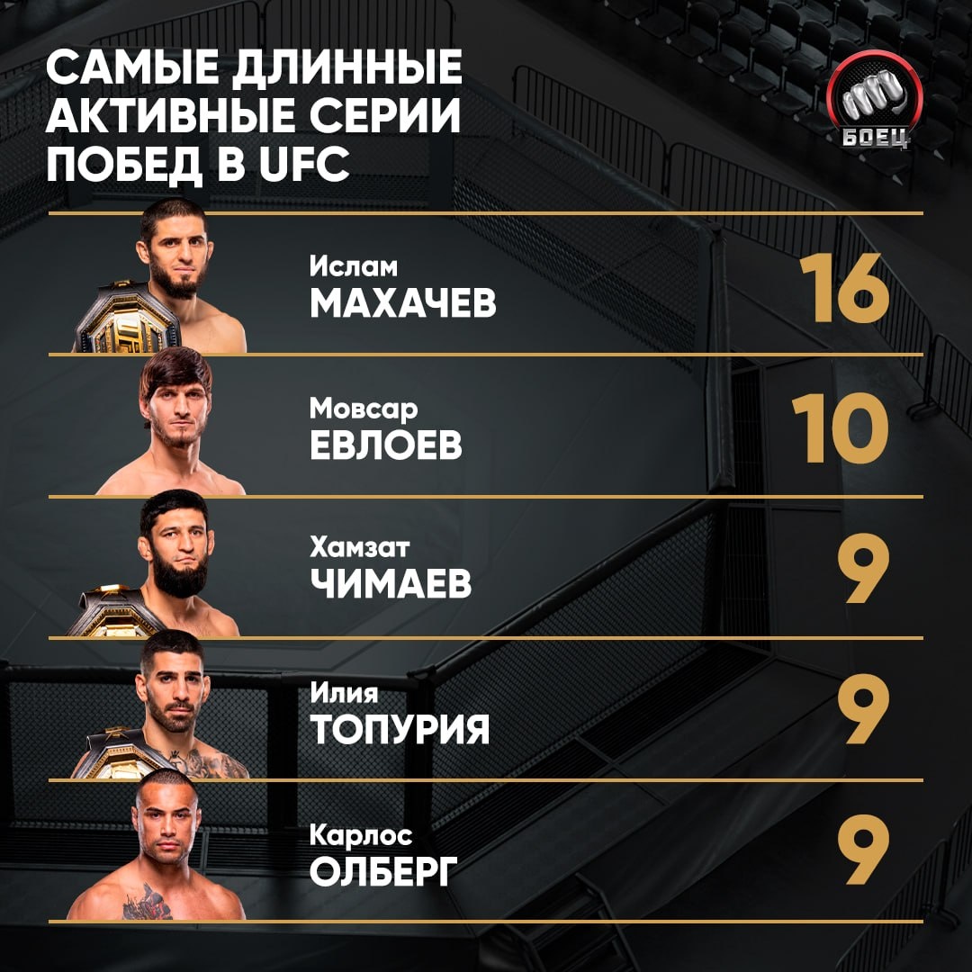 10 побед подряд для Мовсара. Впереди лишь Махачев, но у Ислама серьезный перевес 🏆