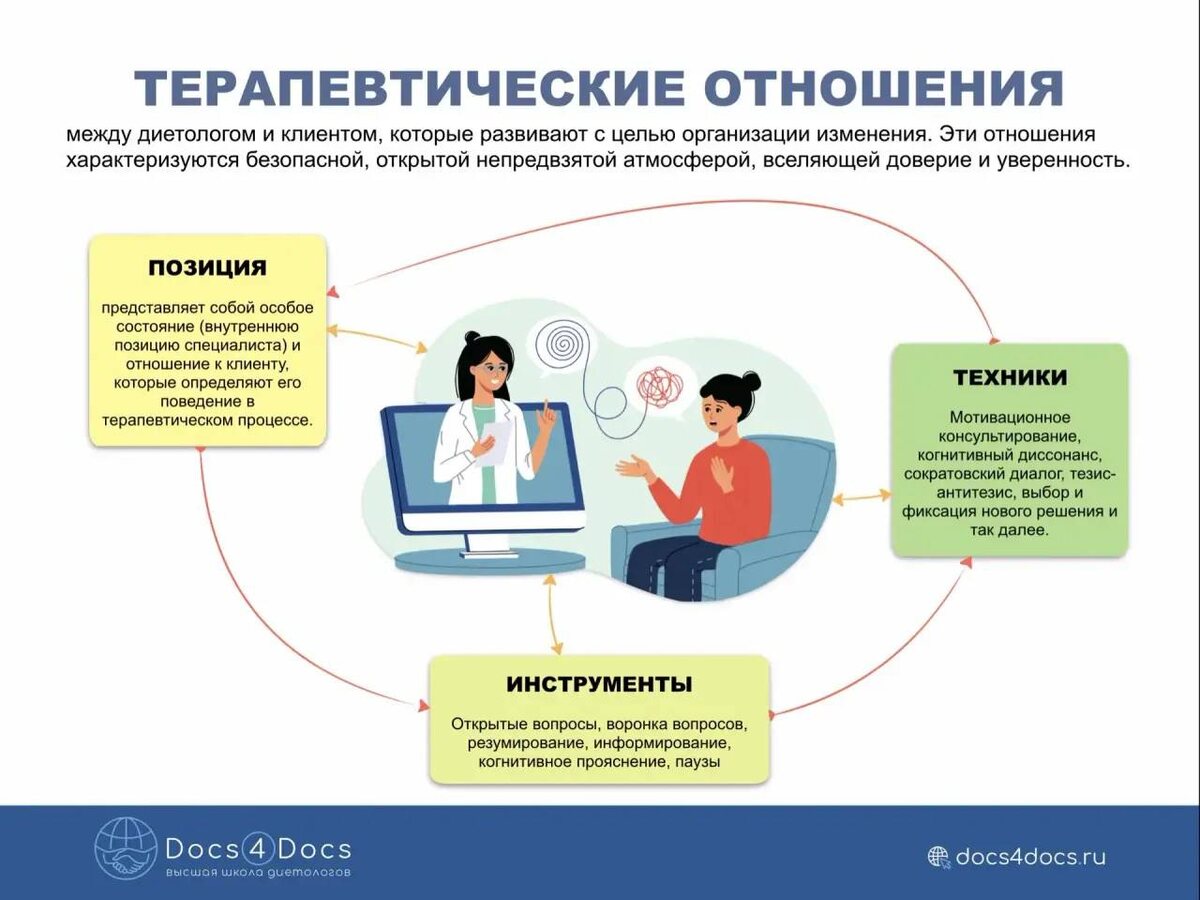 Итак, начнем с 0️⃣ этапа работы! Это установление терапевтических отношений! Если ваши отношения с клиентом не сформированы, то на приеме вы будете заниматься не изменением, а спорами и сопротивлением. Удовольствия 0, эффективность 0! Терапевтические отношения - отношения между диетологом и клиентом, которые развивают с целью организации изменения. Эти отношения характеризуются безопасной, открытой непредвзятой атмосферой, вселяющей доверие и уверенность. Наши клиенты не должны быть мастерами коммуникации. Ответственность за формирование рабочего альянса лежит на плечах специалиста. Как сформировать крепкие отношения? 1️⃣ Ваша терапевтическая позиция: Если вам не интересно, что перед вами за человек, то и клиент собой не заинтересуется. Диетолог не дает советы, диетолог помогает клиенту самому дать себе эффективный совет. О том, как формировать план действий на неделю, мы разбираем в Лаборатории Диетолог не лечит, а обучает клиента жить новую жизнь. Да здравствуют, информацио