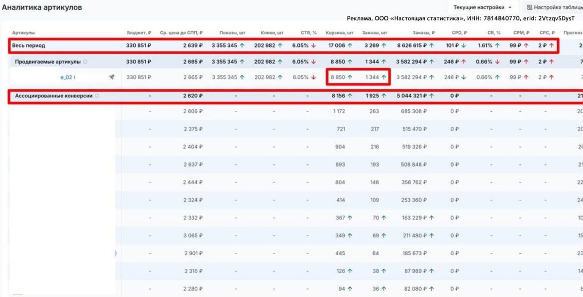 Это может быть ваш лучший актив. Первая реакция большинства селлеров при виде такой цифры - выключить рекламу. Логика понятна: «уходит в минус, зачем платить». Но именно здесь и начинается разница между теми, кто управляет бизнесом, и теми, кто управляет кабинетом. Вот реальный кейс от ребят из TrueStats. Артикул-локомотив - ДРР 19%. По стандартным меркам - провал. Но смотрим шире: заказы по рекламе на этот артикул - 8 850 штук. А общее количество корзин по всей склейке - 17 006. Половина продаж - это товары, на которые реклама вообще не тратилась. Люди заходили через локомотив, а покупали другие цвета, комплектации, модели. ДРР на них - ноль. Выключаешь «дорогой» артикул - обрушиваешь всю связку и теряешь органику, которую он тащил за собой. Проблема в том, что кабинеты WB и Ozon этого не показывают. Ты видишь расход по артикулу, но не видишь, что происходит с экономикой всей системы. В сервисе TrueStats есть полезный модуль РНП — это управление юниткой каждого артикула. РНП свод