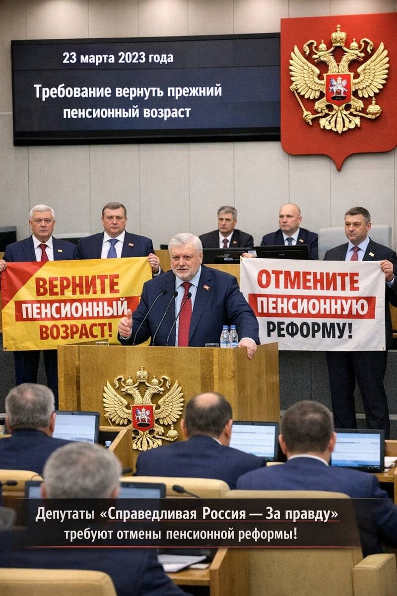 2023 год: Требование вернуть прежний пенсионный возраст 23 марта 2023 года депутаты фракции «Справедливая Россия — За правду» во главе с Сергеем Мироновым официально потребовали отменить пенсионную реформу и вернуть прежний возраст выхода на пенсию. 📌 Это произошло в день отчёта Правительства в Государственной Думе. Справедливороссы заявили, что поставят перед Кабмином ряд острых социальных вопросов, и вопрос отмены пенсионной реформы стал одним из ключевых. ⚖️ Суть требования: Парламентарии настаивали на пересмотре пенсионного законодательства, указывая, что повышение пенсионного возраста негативно отразилось на благосостоянии граждан. 📌 Итог: Хотя сам закон об отмене реформы принят не был, это событие стало важным индикатором общественных настроений и законодательной повестки, демонстрируя постоянное давление на власть с целью смягчения пенсионной политики. #пенсионное_законодательство #история #Госдума #23марта #пенсионнаяреформа