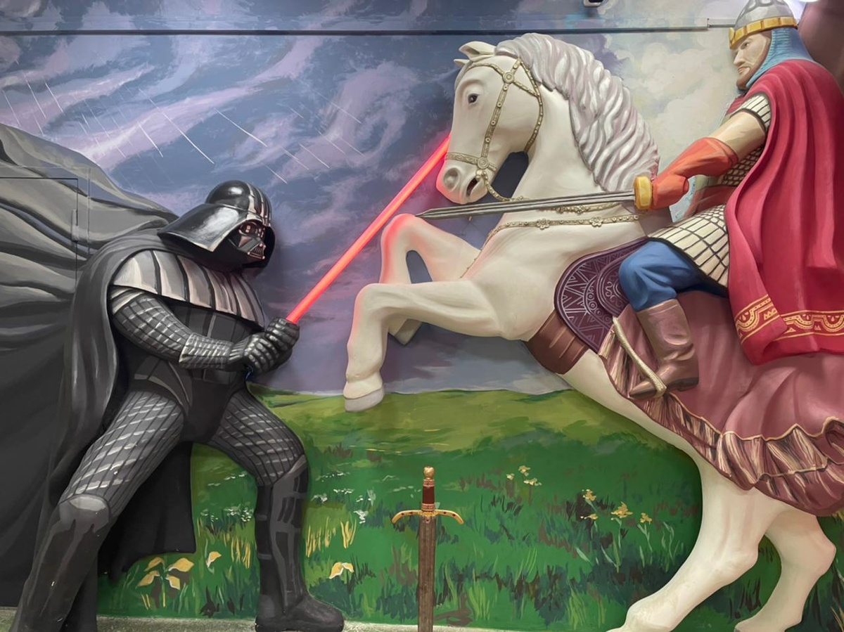 В детской поликлинике №8 в Челябинске нарисовали Александра Невского, который сражается с Дартом Вейдером. Горельеф украшает один из холлов. Непонятно, чья взяла, однако коллектив поликлиники уверяет — победил витязь, а точнее Александр Невский, чей образ постарались передать художники. Великий русский князь и святой появился на стене поликлиники неслучайно — ДГКП №8 официально присвоили имя Александра Невского. По словам главного врача учреждения, такая идея возникла в 2018-ом, и активно обсуждалась в коллективе. В год 800-летия со дня рождения великого князя-полководца поликлинику переименовали. — Мы предложили не просто имя Александра Невского, а ждали варианты от коллектива. Было несколько идей: православные — Петра и Февронии, целителя Пантелеймона, несколько фамилий известных врачей. Потом коллектив голосовал, и выбрали имя Александра Невского, — рассказывает главврач ДГКП №8 Антон Рыжий. Воплотить идею в жизнь Антону удалось в 2021 году. В честь празднования 800-летия со дня Рож
