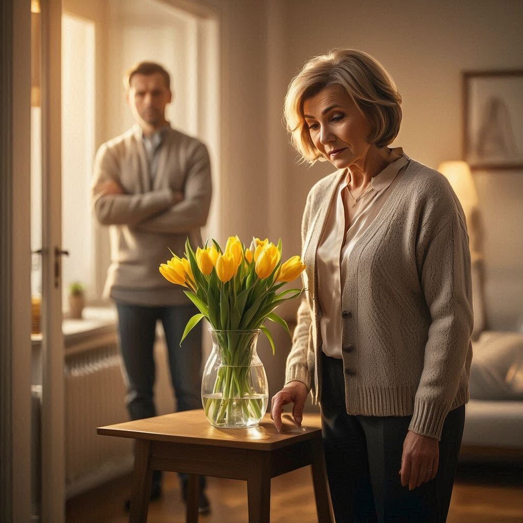 Галина шла домой после работы. Обычный вторник, серый, никакого повода. У цветочного притормозила — там стояли жёлтые тюльпаны в вёдрах прямо на улице, яркие, почти кричащие среди мартовского асфальта. Она остановилась, подумала секунду — и купила. Пять штук. Пришла домой, нашла вазу, поставила на стол в гостиной. — Кто подарил? — спросил муж, не отрываясь от телефона.