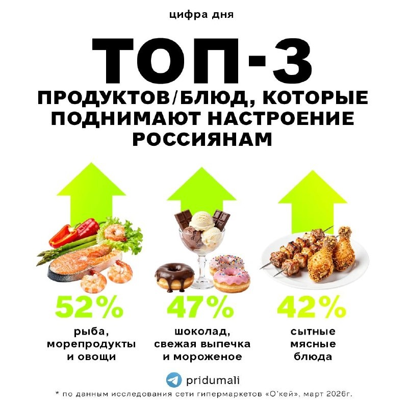 В рубрике «Цифра дня» данные сети гипермаркетов О’КЕЙ — около 52% россиян предпочитают поднимать себе настроение рыбой, морепродуктами и овощами. И это самый высокий показатель среди разных категорий. В топ-3 попали: 1️⃣рыба, морепродукты и овощи (52%) 2️⃣шоколад, свежая выпечка и мороженое (47%) 3️⃣сытные мясные блюда (42%) Также поднимать настроение чипсами, сухариками и попкорном предпочитает 11% россиян, а соками, морсами и газировками — 12%. 👉ПРИДУМАЛИ фуд-медиа в 🕊Telegram и Max #исследования