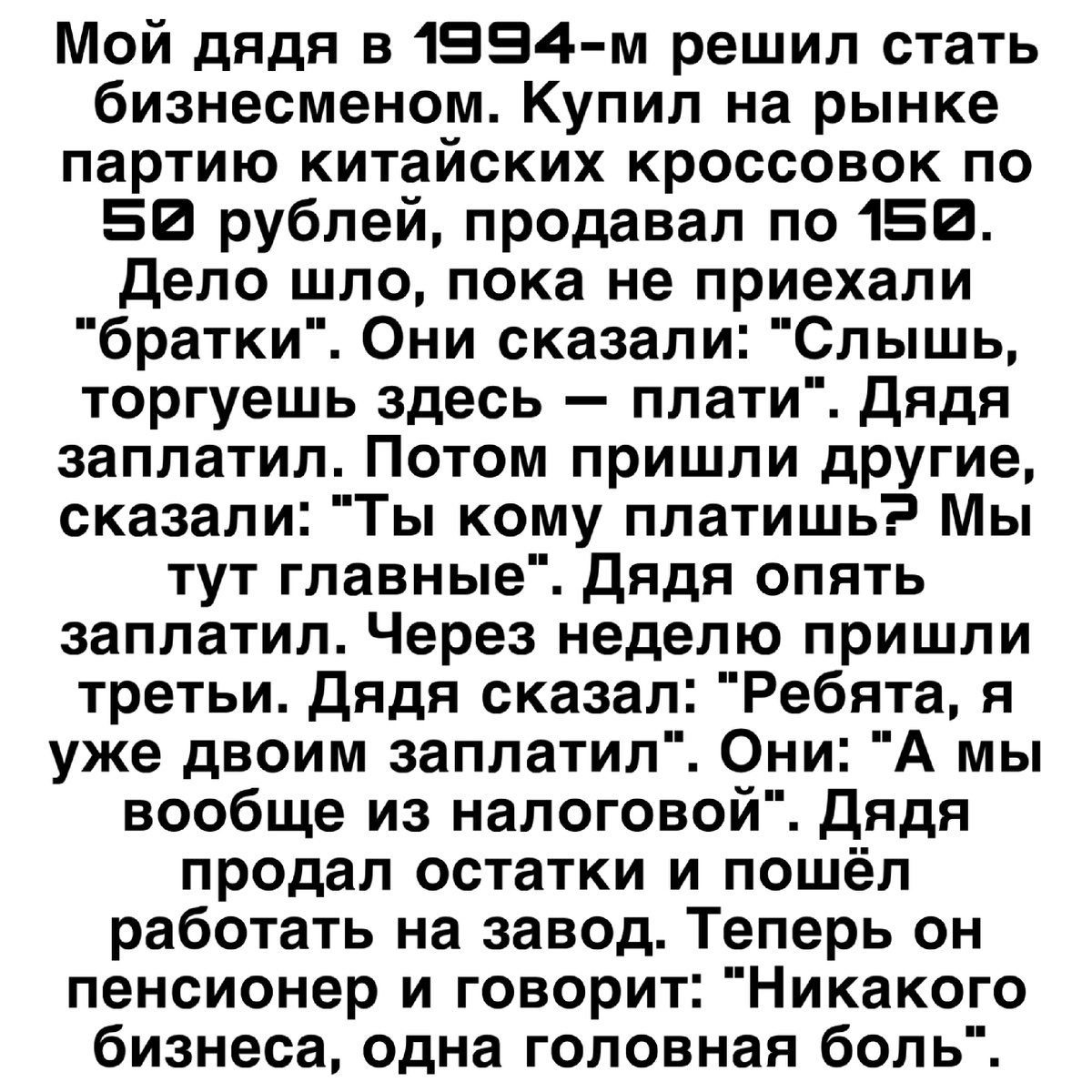 Мой дядя в 1994-м решил стать бизнесменом. Купил на рынке партию китайских кроссовок по 50 рублей, продавал по 150. Дело шло, пока не приехали "братки". Они сказали: "Слышь, торгуешь здесь — плати". Дядя заплатил. Потом пришли другие, сказали: "Ты кому платишь? Мы тут главные". Дядя опять заплатил. Через неделю пришли третьи. Дядя сказал: "Ребята, я уже двоим заплатил". Они: "А мы вообще из налоговой". Дядя продал остатки и пошёл работать на завод. Теперь он пенсионер и говорит: "Никакого бизнеса, одна головная боль".