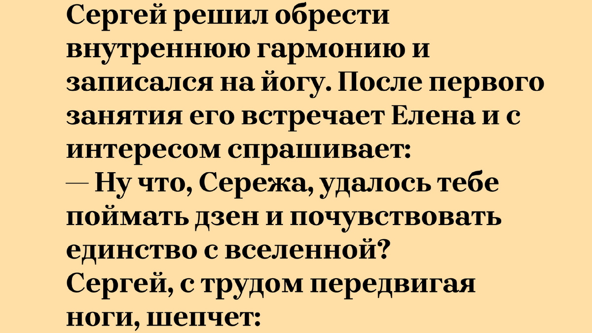 Йога — это удивительное занятие. Я всегда думал, что это про расслабление и благовония, пока сам не попробовал завязаться в узел. Сергей столкнулся с тем, что я называю физическим самопознанием. Это когда твое тело внезапно начинает с тобой разговаривать, и, честно говоря, его тон оставляет желать лучшего. Мы идем на йогу за духовным ростом, а получаем осознание того, что мы не гнущиеся тростинки, а скорее старые скрипучие шкафы. Это и есть настоящий путь воина: пытаться сохранить одухотворенное лицо, когда твоя левая пятка пытается познакомиться с твоим правым ухом. Зато после такого опыта начинаешь ценить простые радости жизни, вроде возможности просто сесть на стул без посторонней помощи. В этом и кроется истинное просветление — ценить то, что у тебя ничего не болит, когда ты просто стоишь.